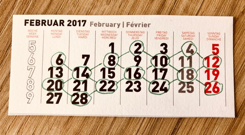 So könnte es aussehen, wenn deine Matheforscher Muster auf dem Kalenderblatt entdecken und einzeichnen. Hier wurden die geraden Zahlen eingekreist und anschließend miteinander verbunden. Das regt gleich zu neuen Entdeckungen an, denn so sind die Diagonalen gut zu sehen. „In welchen Diagonalen sind Ergebnisse von Malfolgen?“