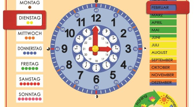 Für den Bereich Zeit: Uhren, z.B. Armbanduhr, Stoppuhr, Wecker und Kalender. Aber auch Materialien zum Herstellen von Sand-, Wasser- und Sonnenuhren.